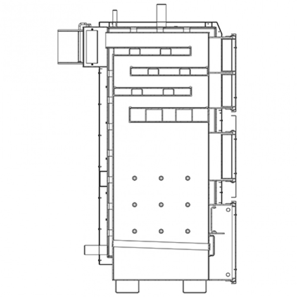 - Топка котла объемом 91 дм3, выполнена из цельного листа жаропрочной стали. Все сварные швы вынесены из зоны горения и проварены как изнутри, так и снаружи. В боковых частях топки предусмотрены воздушные форсунки для подачи дополнительного кислорода непосредственно в зону горения различного твердого топлива. При таких конструктивных особенностях топки заложен принцип верхнего горения топлива, топливо сгорает слоями, сверху вниз, тем самым происходит экономичное и эффективное сжигание.