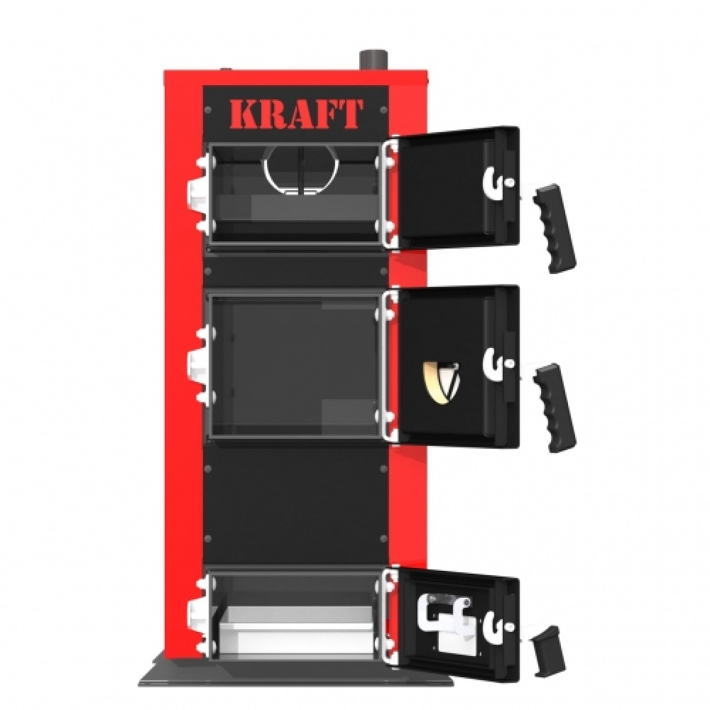 В твердотопливном котле длительного горения KRAFT серии E предусмотрено три двери: верхняя для чисти теплообменники, средняя дверь – загрузочная, нижняя – для обслуживания колосниковой зоны и чистки золы. Все двери оборудованы термостойкими ручками удобной конструкции.