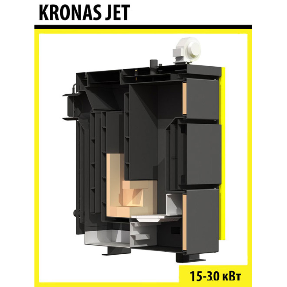 Шахтный котел модели Kronas JET является твердотопливным стальным котлом нижнего способа сгорания твердотельного топлива с использованием керамического катализатора. Мощностью от 15 до 30 кВт, что в свою очередь, позволяет отапливать площади от 120 до 320 метров квадратных. Работа котла допустима в режиме ручной загрузки топлива.