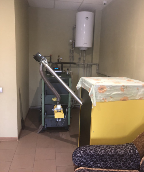 В поселке городского типа Андреевка, на твердотопливный котел нижнего горения, ручной загрузки, польского производства SAS NWG 23 кВт установлена пеллетная горелка факельного типа, харьковского производства марки Kvit Lyuta 16 кВт. Рядом с котлом, у стены, поставлен загрузочный бункер для подачи пеллетного топлива, при помощи шнекового питателя, в камеру сгорания твердотопливного котла. Расход пеллетного топлива в автоматическом режиме1,2-1,5 кг/час.