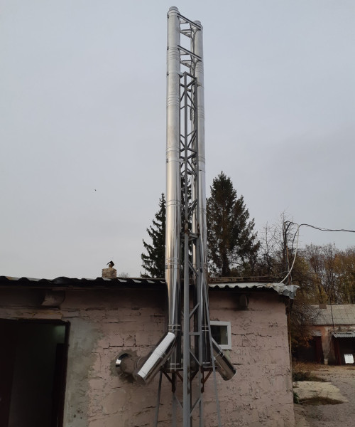 В комплексе произведен монтаж дымоотводящей системы утепленного вида внутренним диаметром ф180мм. Дымоход изготовлен из нержавеющей стали, марка стали AISI 321, толщиной 1,0мм. В качестве утеплителя использована негорючая базальтовая вата на армирующей основе. Покровный защитный слой выполнен из технической нержавеющей стали марки AISI 430 толщиной 0,5мм. Для увеличения надежности опорной конструкции сварена ферма из профильного металла, которая воспринимает на себя несущую способность дымоходной системы.